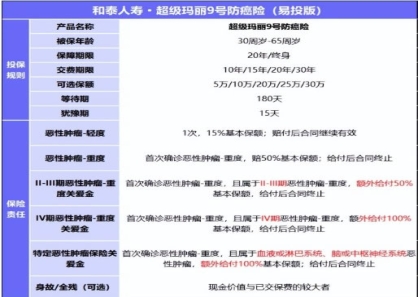 和泰人寿超级玛丽9号防癌险(易投版)允许30周岁-60周岁的人群投保,可以选择保终身或保...