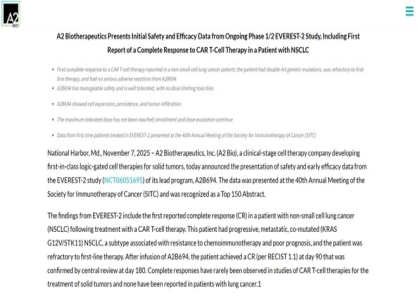 2025年11月7日,在SITC年会上,A2 Biotherapeutics公布的一份报...